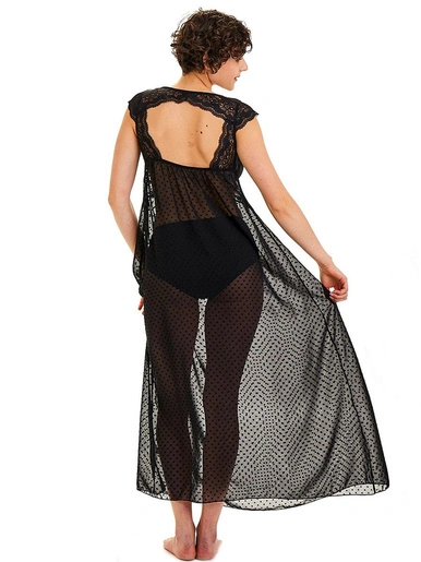 Nuisette longue en mousseline plumetis légèrement transparente. Décolleté, bretelles, épaules et ouverture dos en dentelle végétale.