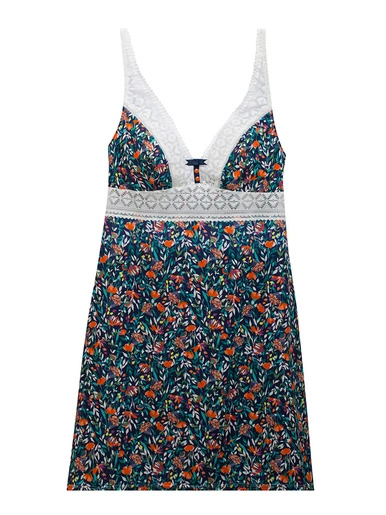 Nuisette en microfibre imprimée au motif fleurs de printemps. Décolleté en dentelle texturée géométrique. Ruban satin et boutons émaillés à l’entre-seins. Bretelles fines et réglables. Galon de dentelle sous poitrine.