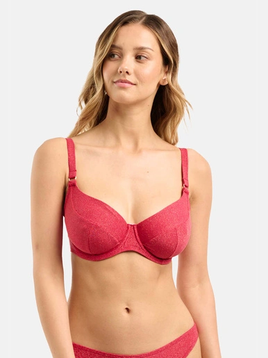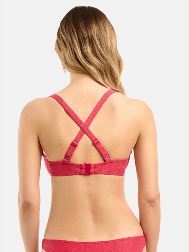 Ce haut de maillot de bain à la coupe emboitante est très confortable et maintient bien grâce à sa construction de bonnet en 3 parties et ses armatures. Réalisé dans une maille lurex scintillante il est très chic et donne un éclat lumineux pour l’été. Il se décline dans deux coloris très frais et tendance qui brillent de mille feux et des anneaux dorés viennent habiller le départ bretelles.
