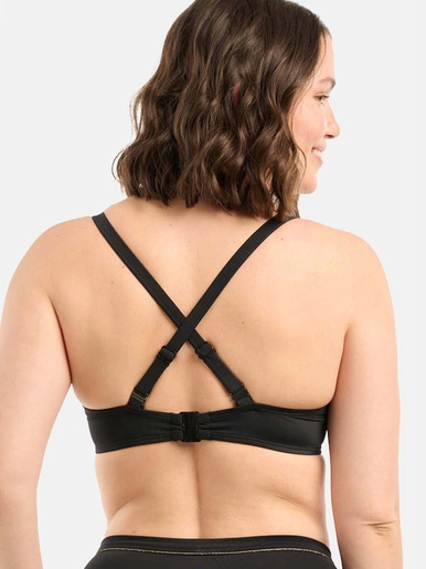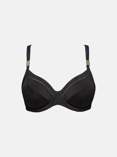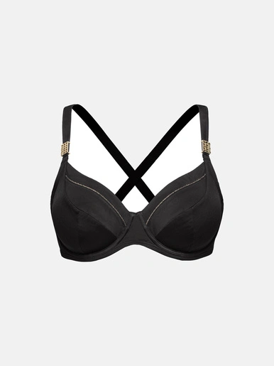 – Le coloris noir est contrasté avec les bijoux dorés au départ des bretelles et le liseré doré tout le long du décolleté