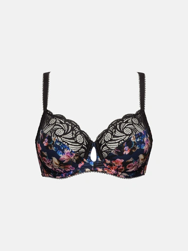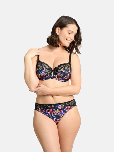 Ce soutien-gorge à armatures a une construction de bonnets en 2 parties. Le bas bonnet est en microfibre imprimée tandis que le haut du bonnet est en dentelle ajourée au motif en forme de volutes. L’association des deux matières donne un look bohème chic. Les picots fantaisie, les écailles, le bijou et la découpe effet goutte à l’entre-seins apportent davantage de féminité au modèle. Pour un max de confort, les bretelles sont réglables, le dos est en U et des baleines sont placées sur les côtés.