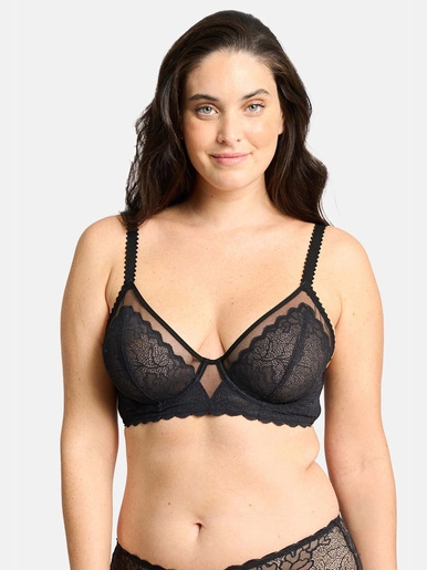 – Les empiècements de tulle sur le haut du bonnet et à l’entre-seins laissent apparaitre délicatement la peau